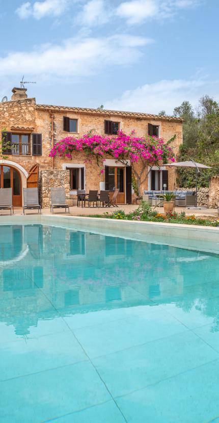 Direkt vor der Finca befinden sich die große Sonnenterrasse und der einladende 9 m langer Pool. HIer befindet sich auch einen herrlichen Sitzplatz mit Sofas und Blick auf Pool und Garten. Der alte Baumbestand spendet vor allem in den heißen Sommermonaten natürlichen Schatten.