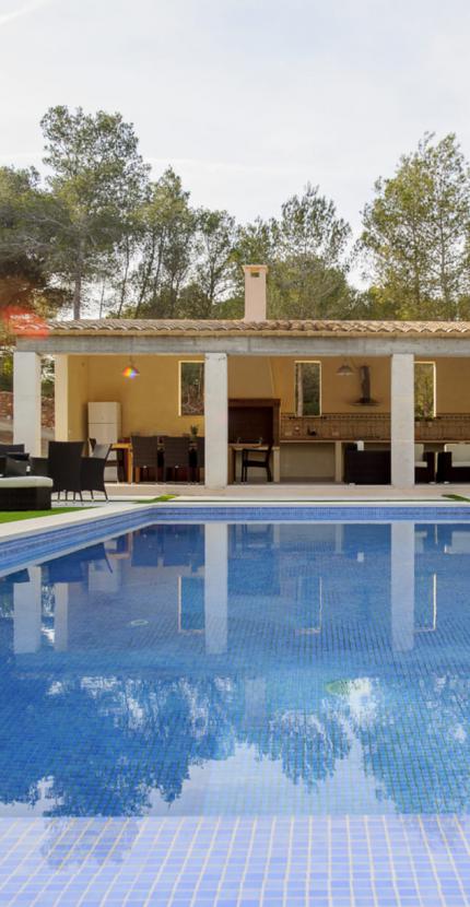 Die 350 qm Wohnfläche der Finca "Villa Pins" verteilen sich auf 2 Ebenen und ein Anbau. Innen ist die Finca modern und geschmackvoll eingerichtet. Große bodentiefe Fenster in fast allen Räumen sorgen für viel Licht.  Vom stylischen Wohnbereich mit Kamin und angrenzendem Essbereich genießt man einen großartigen Blick in den Garten. Die abgetrennte Küche ist sehr gut ausgestattet. Insgesamt verfügt diese Finca über 5 geräumige Schlafzimmer, die Platz für 10 Personen bieten. Von jedem Schlafzimmer im Haupthaus hat man Zugang auf eine Terrasse oder einen Balkon.